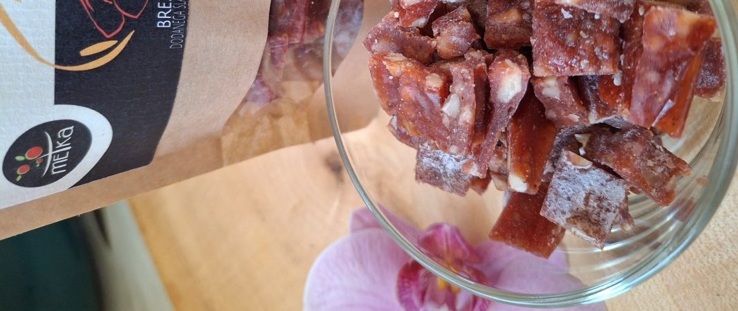 Sestavine: kutine 50%, zgoščen grozdni sok, orehi 15%, posip proti sprijemanju: riževa moka. Hranite v suhem in hladnem prostoru.